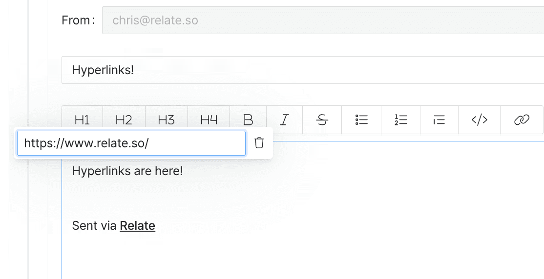 Relate got a quality of life update β you can now add links to email drafts in Relate and email drafts are automatically saved.