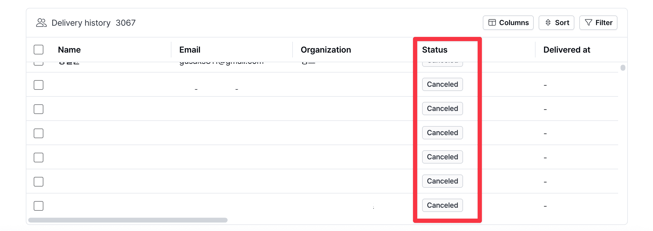 Hovering over the Canceled status in Campaign > Analytics > Status provides additional information on the cancellation reason.