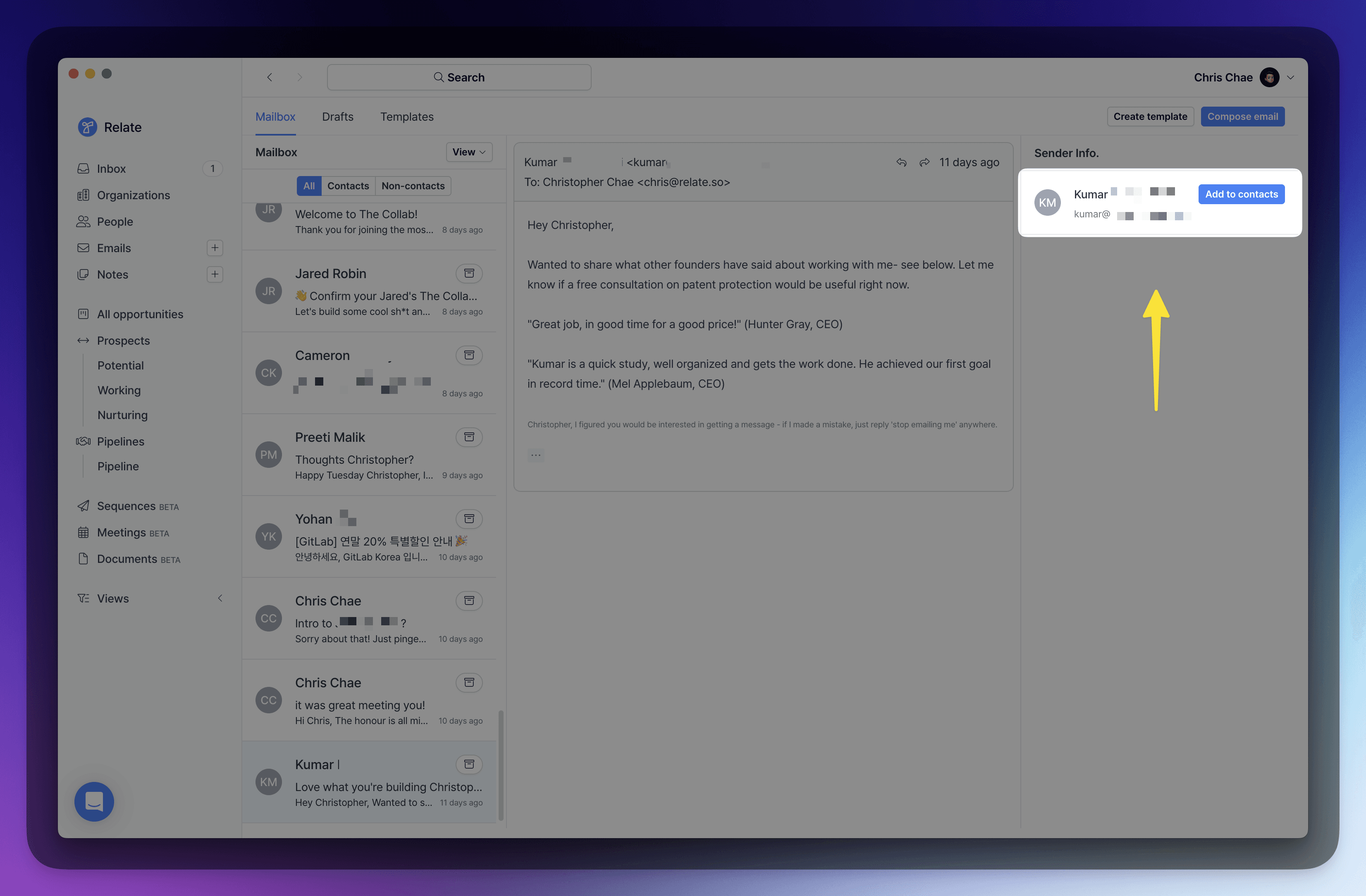 Add new prospects as contacts in Relate with a single click. Relate now ingests your email mailbox and allows you to add senders and recipients as contacts in Relate.